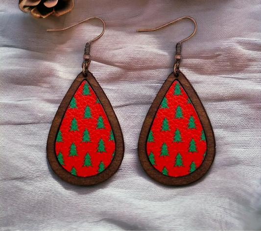 Wood and Leather Christmas Tree Drop Earrings
