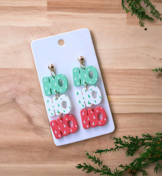 "Ho Ho Ho" Red, White, and Green Holiday Stud Drop Earrings