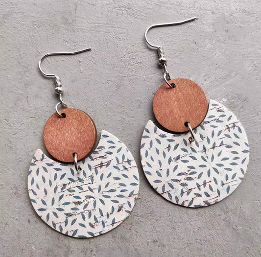 Round White and Blue Wood and Cork Earrings
