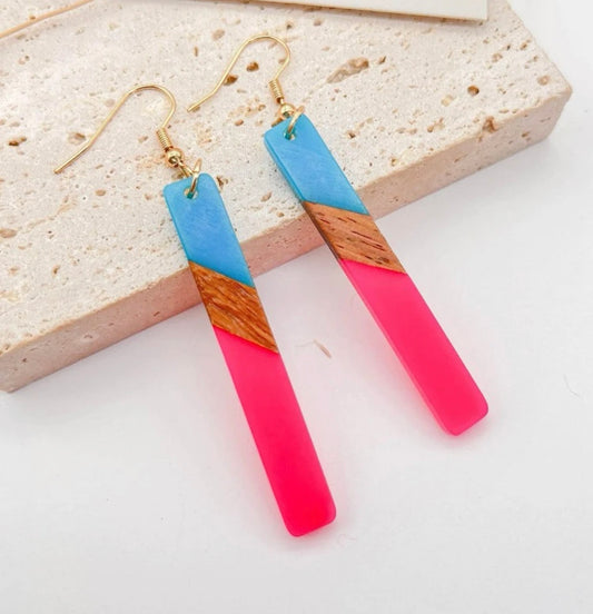 Turquoise and Hot Pink Resin and Wood Bar Earrings